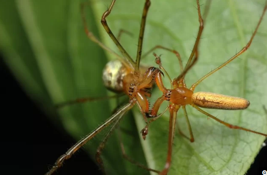 Two spiders in the genus Tetragnatha mating.