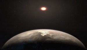 Bu illüstrasyon ılıman gezegen Ross 128 b’yi, arka planda ise kırmızı cüce yıldızı gösteriyor. Dünyadan sadece 11 ışık yılı uzaklıkta