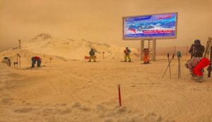 Sahra Çölü’nden taşınan kumlar sebebiyle birçok ülkenin kar tabakası turuncuya boyandı. Özellikle kayak merkezlerinden ve yüksek zirvelerden gelen görüntüler oldukça