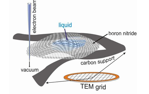 By trapping minute amounts of liquid between two two-dimensional layers of boron nitride, the liquid sample can be imaged at extremely high resolution using a traditional transmission electron microscope and spectroscopy techniques. This approach could provide information on the vibrational state of individual molecules.