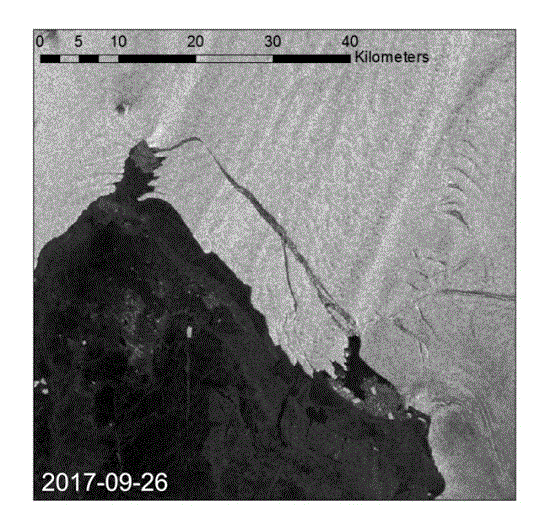 Fakat aşağıdaki hareketli görselde görüldüğü üzere buzul, aylar geçmesine rağmen sadece birkaç kilometre uzaklaşabildi ve parçalarına ayrılmaya başladı: