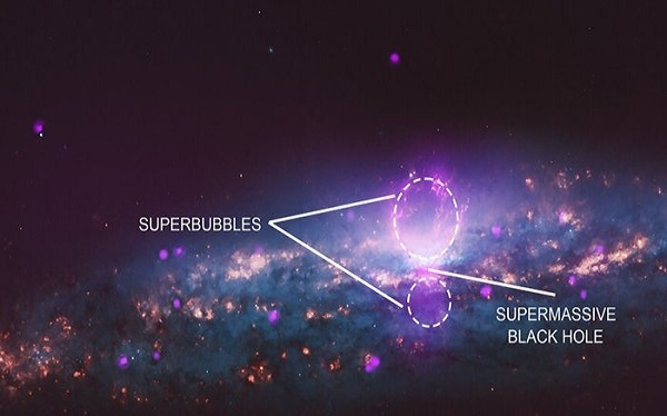 Observations from NASA’s Chandra X-ray Observatory of spiral galaxy NGC 3079 have revealed that the bubbles are actually a huge cosmic particle accelerator, producing energetic high-speed particles around their edges.