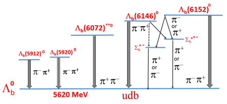 Mavi ve yeşil olarak gösterilen bu iki keskin pik, Λb(6146)0 ve Λb(6152), LHCb’de 6 ay önce keşfedildi. Geniş kırmızı dağılım ise yeni keşfedilen Λb**0 parçacığını dağılımını gösteriyor.2S uyarılmış halinde kuantum mekanik temel kurallarına göre , 1D halindeki diğer iki pike oranla çok daha kısa ömürlüdür. Yeni Λb**0 baryonunun kütlesi 6072.3±2.9±0.6±0.2 MeV, ve genişliği Γ 72±11±2 MeV. Mavi ve yeşil olarak gösterilen bu iki keskin pik, Λb(6146)0 ve Λb(6152), LHCb’de 6 ay önce keşfedildi.
