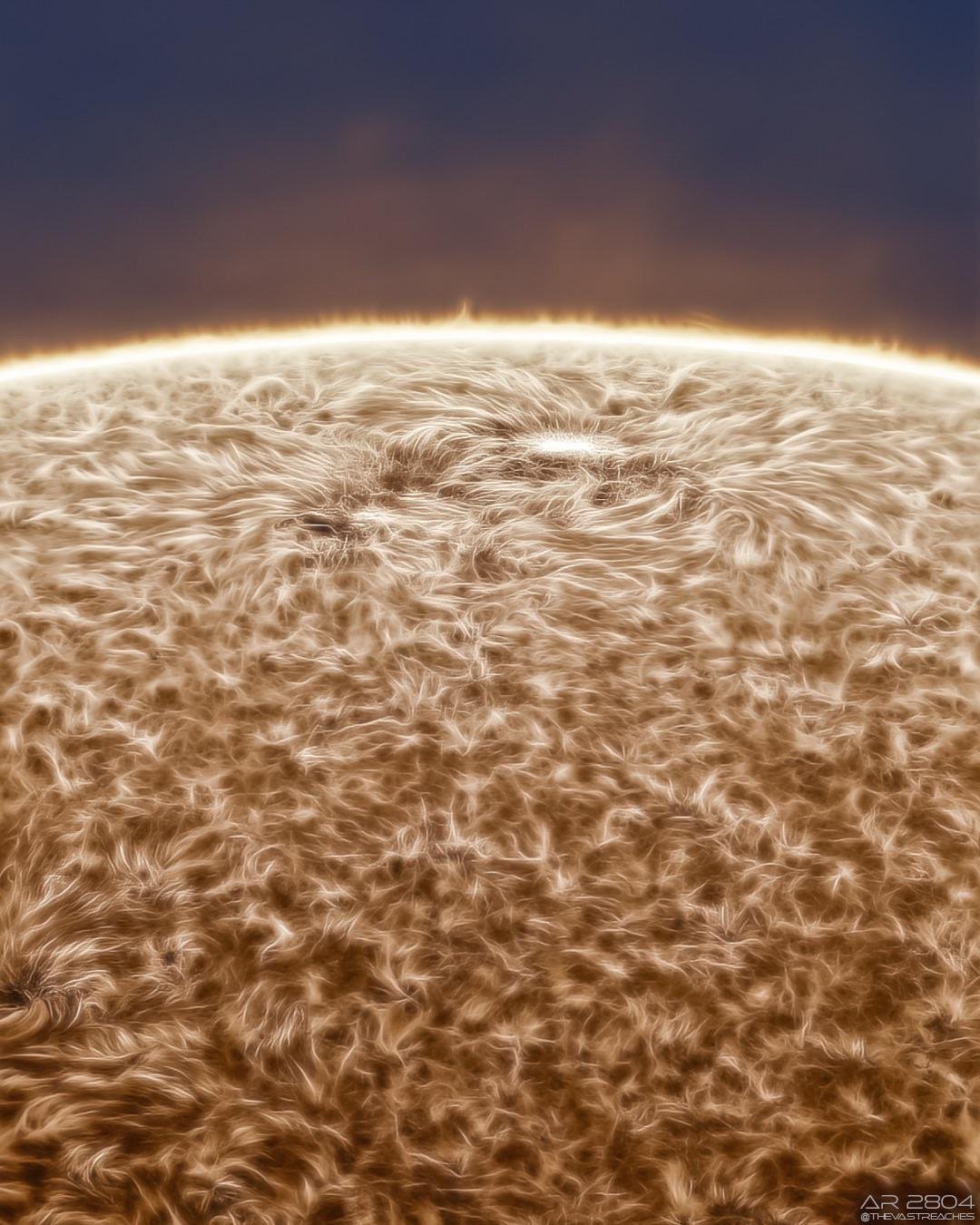 “Bu fotoğraf arka bahçemdeki Güneş teleskobuyla çekildi” ifadelerini kullanan amatör gözlemci, fotoğrafın “Güneş kromosferinin (yıldızın atmosferinin üç ana katmanından ikincisi) çalkantılı doğasını” gözler önüne serdiğini söyledi: