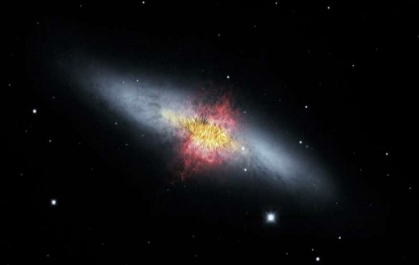 Besides being a classic example of a starburst galaxy, because it is forming an extraordinary number of new stars compared with most other galaxies, M82 also has strong winds blowing gas and dust into intergalactic space. Astronomers have long theorized that these winds would also drag the galaxy’s magnetic field in the same direction, but despite numerous studies, there has been no observational proof of the concept.