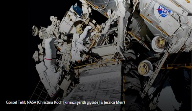 Uluslararası Uzay İstasyonu’nda bulunan NASA astronotları Christina Koch ile Jessica Meir, 18 Ekim 2019 tarihinde yaptıkları uzay yürüyüşünde istasyonun güneş pilleriyle ilgili arızalı bir parçayı değiştirdi ve yeni bir destek direği monte etti. (Telif: NASA)