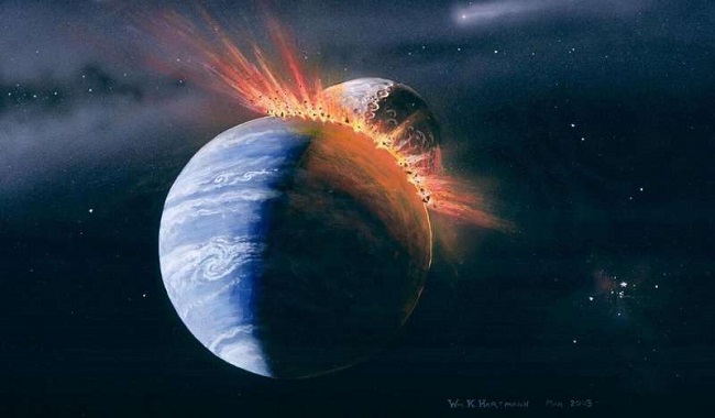 They started from the idea that both the Earth and the giant object were vaporized after the impact. In this scenario, a mass that will become Earth slowly coalesces, and an outer ring of debris forms around it. It’s still so hot, nearly 6,000 degrees Fahrenheit, that this ring is probably an airy outer layer of vapor surrounding a core of liquid magma.