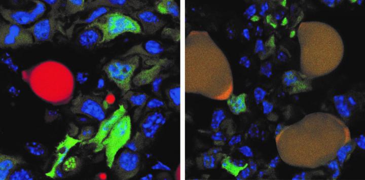 The image above shows this process, with the cancer cells tagged with a green fluorescent protein and normal red fat cell on the left. The cancer-turned-fat cells display as brown (on the right) because the red of the fat cells combines with the green of the protein cancer cell tag.