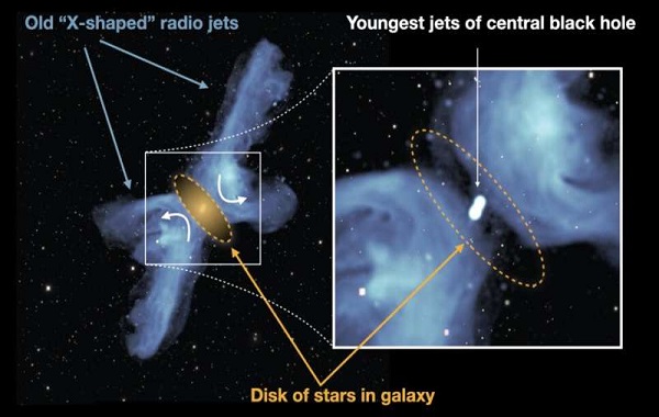 Many galaxies far more active than the Milky Way have enormous twin jets of radio waves extending far into intergalactic space. Normally these go in opposite directions, coming from a massive black hole at the centre of the galaxy. However, a few are more complicated and appear to have four jets forming an ‘X’ on the sky.