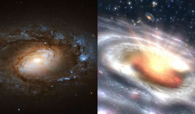 Galaxies come in a wide variety of shapes, sizes and brightnesses, ranging from humdrum ordinary galaxies to luminous active galaxies. While an ordinary galaxy is visible mainly because of the light from its stars, an active galaxy shines brightest at its center, or nucleus, where a supermassive black hole emits a steady blast of bright light as it voraciously consumes nearby gas and dust.