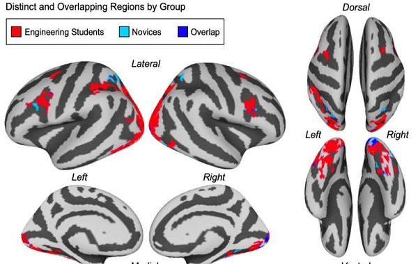 The study found that while both engineering students and novices use the visual cortex similarly when applying concept knowledge about engineering, they use the rest of the brain very differently to process the same visual image. Consistent with prior research, the results demonstrated that the engineering students’ conceptual knowledge was associated with patterns of activity in several brain regions, including the dorsal frontoparietal network that helps enable spatial cognition, and regions of ventral occipitotemporal cortex that are implicated in visual object recognition and category identification.