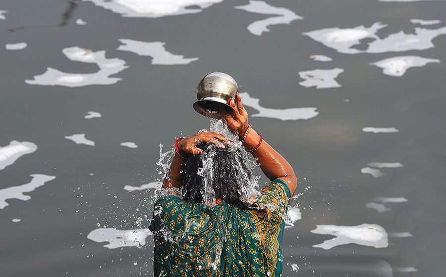 Toksik köpük, Yeni Delhi yakınlarındaki Kutsal Nehir’in çeşitli kısımlarının yüzeyinde katmanlar oluşturdu. Hindular dini bayramları kutlamak için bu nehir boyunca toplanırken bazıları da yıkanmak için içine girdiler.