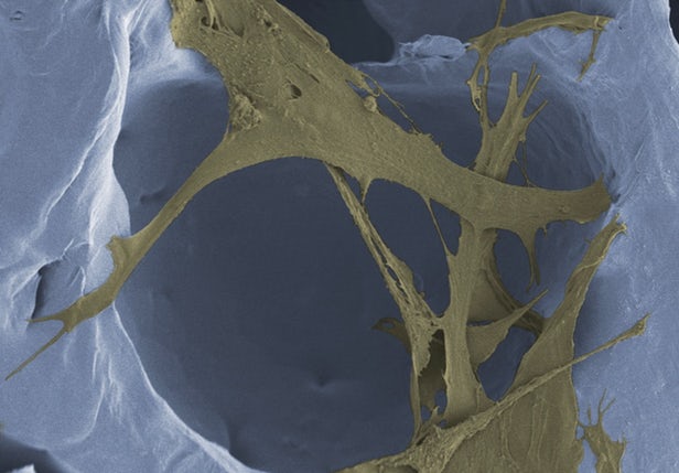 İsviçre Empa Araştırma Enstitüsü ekibi tarafından geliştirilen “Scaravoid” adlı köpük; temel olarak biyo-uyumlu, biyo-bozunur üç boyutlu iskelete sahip bir polimer yapısından oluşuyor. Bu materyalden ince bir parça kesilerek yaraya yerleştiriliyor, köşelerdeki hücreler doğal olarak bölgeye göç ederek, ürüyor ve giderek polimerin yerini alarak doğal biyolojik bir doku oluşturuyor.